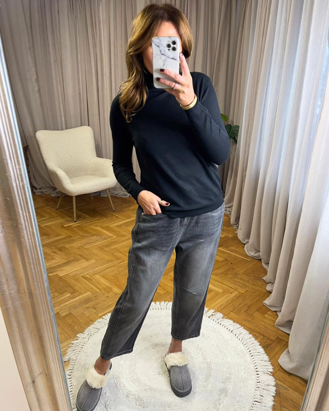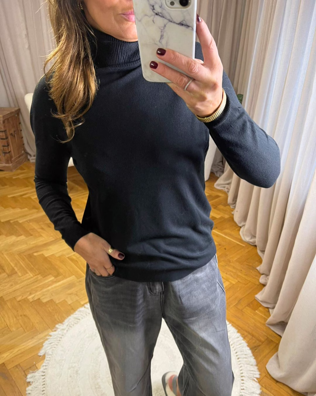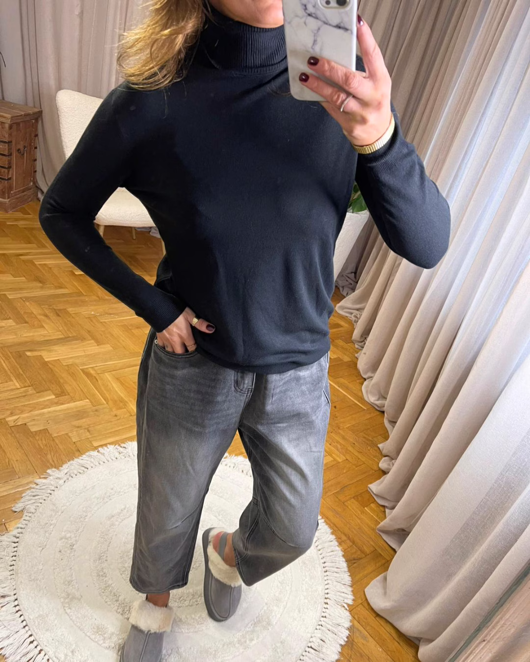 Czarny golf to absolutny klasyk, który potrafi zrobić całą stylizację. Ten model wyróżnia się gładką, elastyczną dzianiną i elegancką stójką, dzięki którym całość prezentuje się wyjątkowo szykownie i nowocześnie. Czerń wysmukla, podkreśla rysy twarzy i świetnie łączy się z każdym kolorem w szafie, dlatego ten golf sprawdzi się zarówno w casualowych zestawach, jak i bardziej wyrafinowanych lookach wieczornych. To idealna baza, gdy zależy Ci na prostocie, minimalizmie i klasie w jednym.