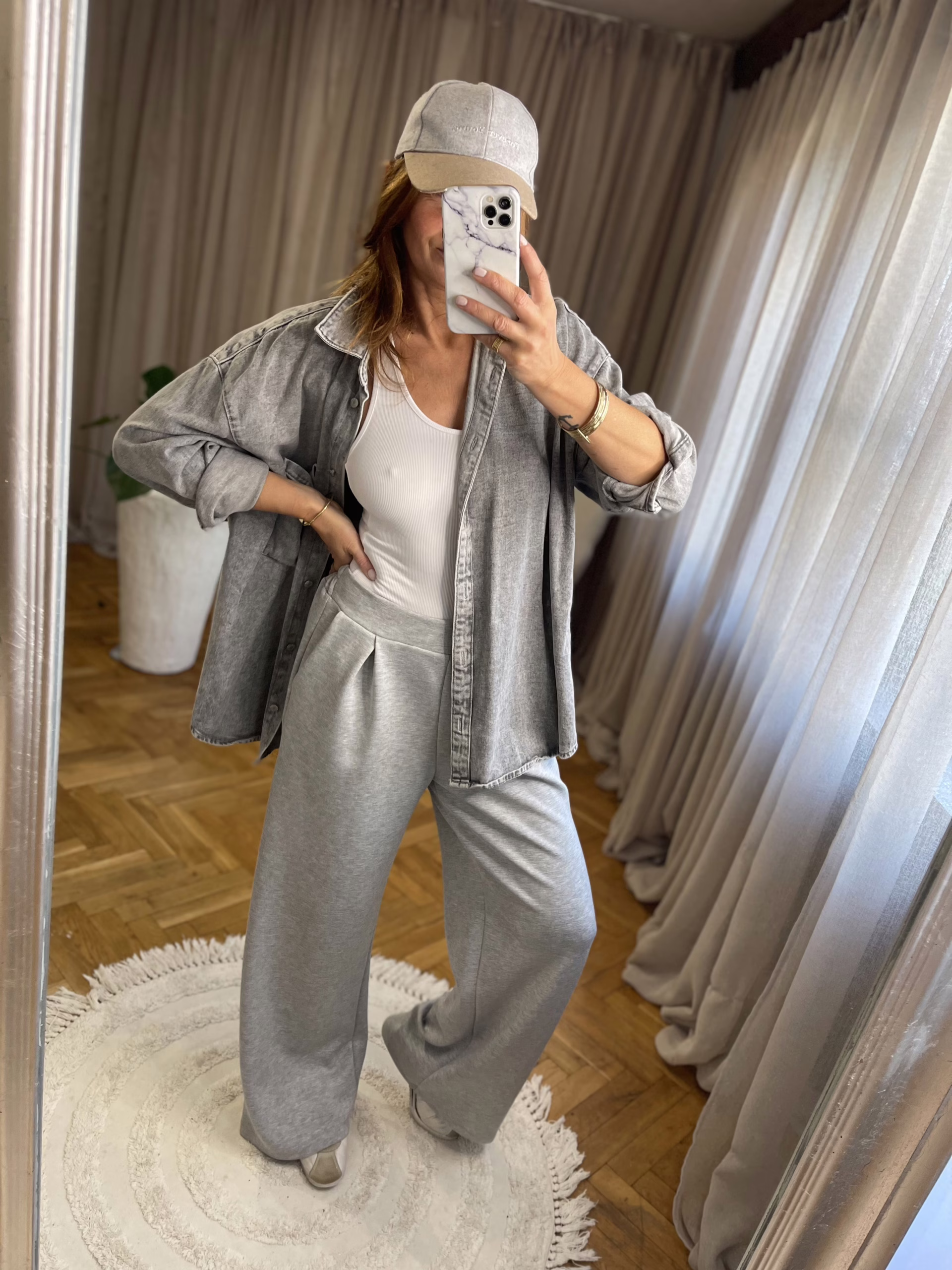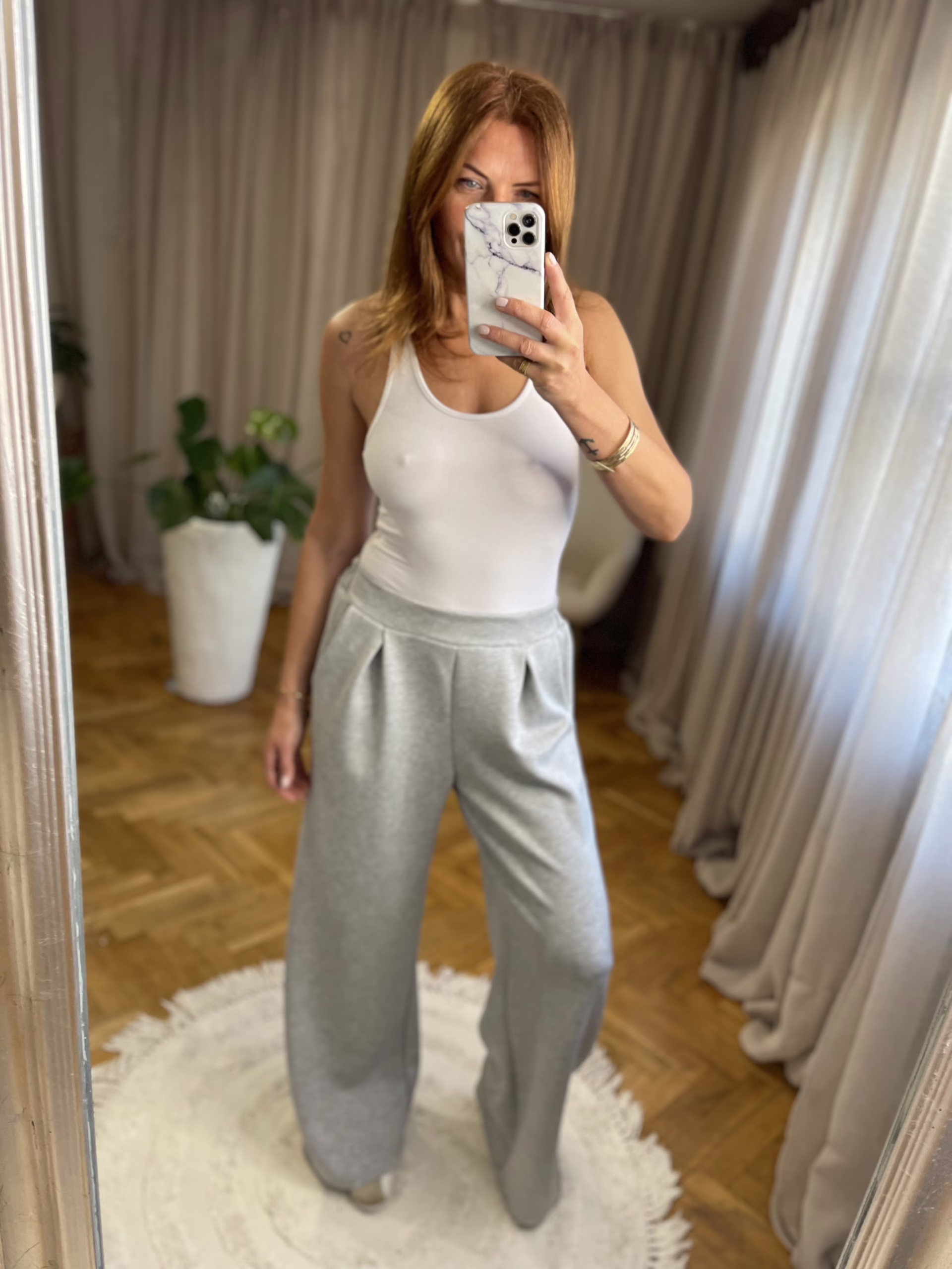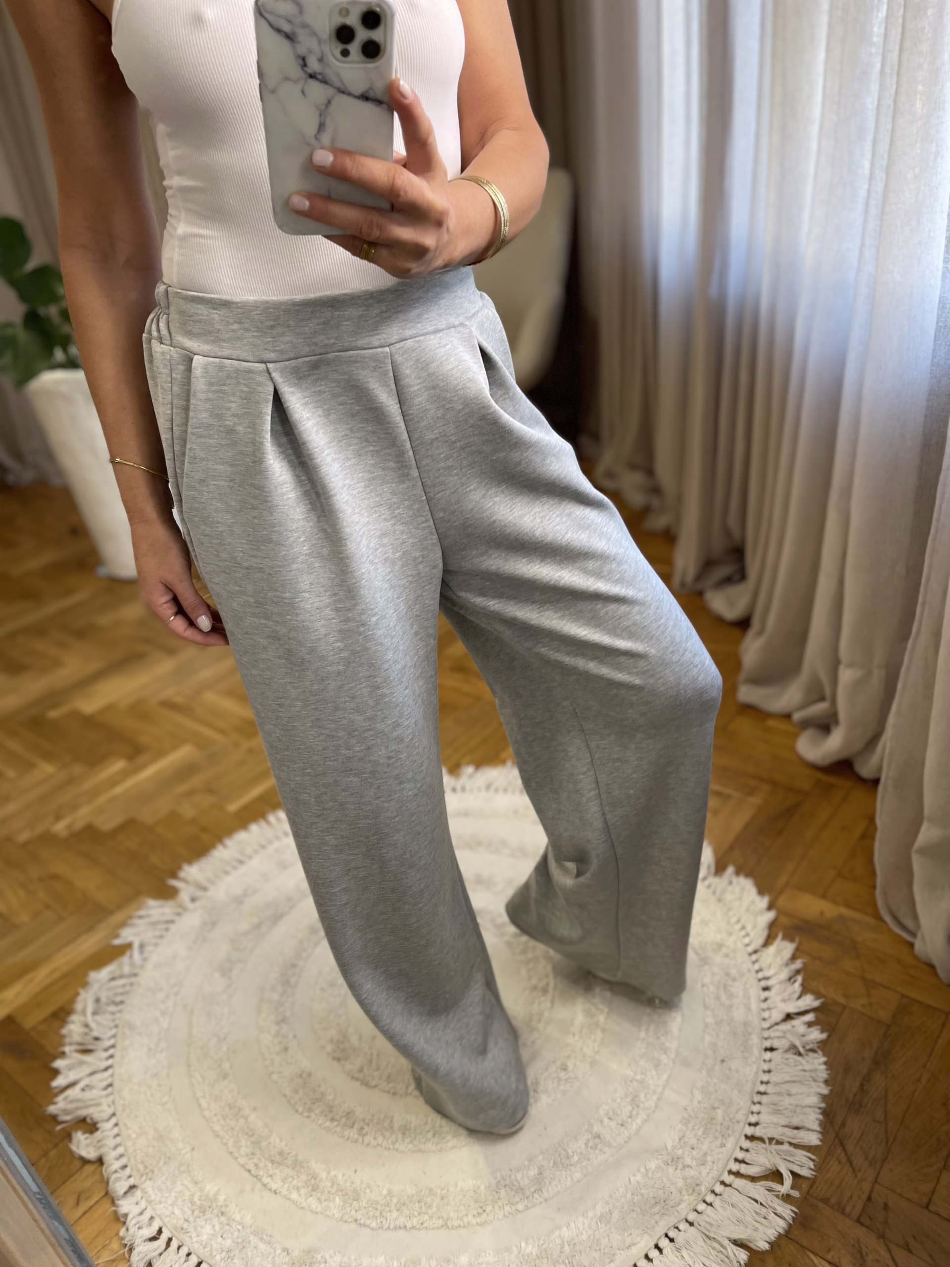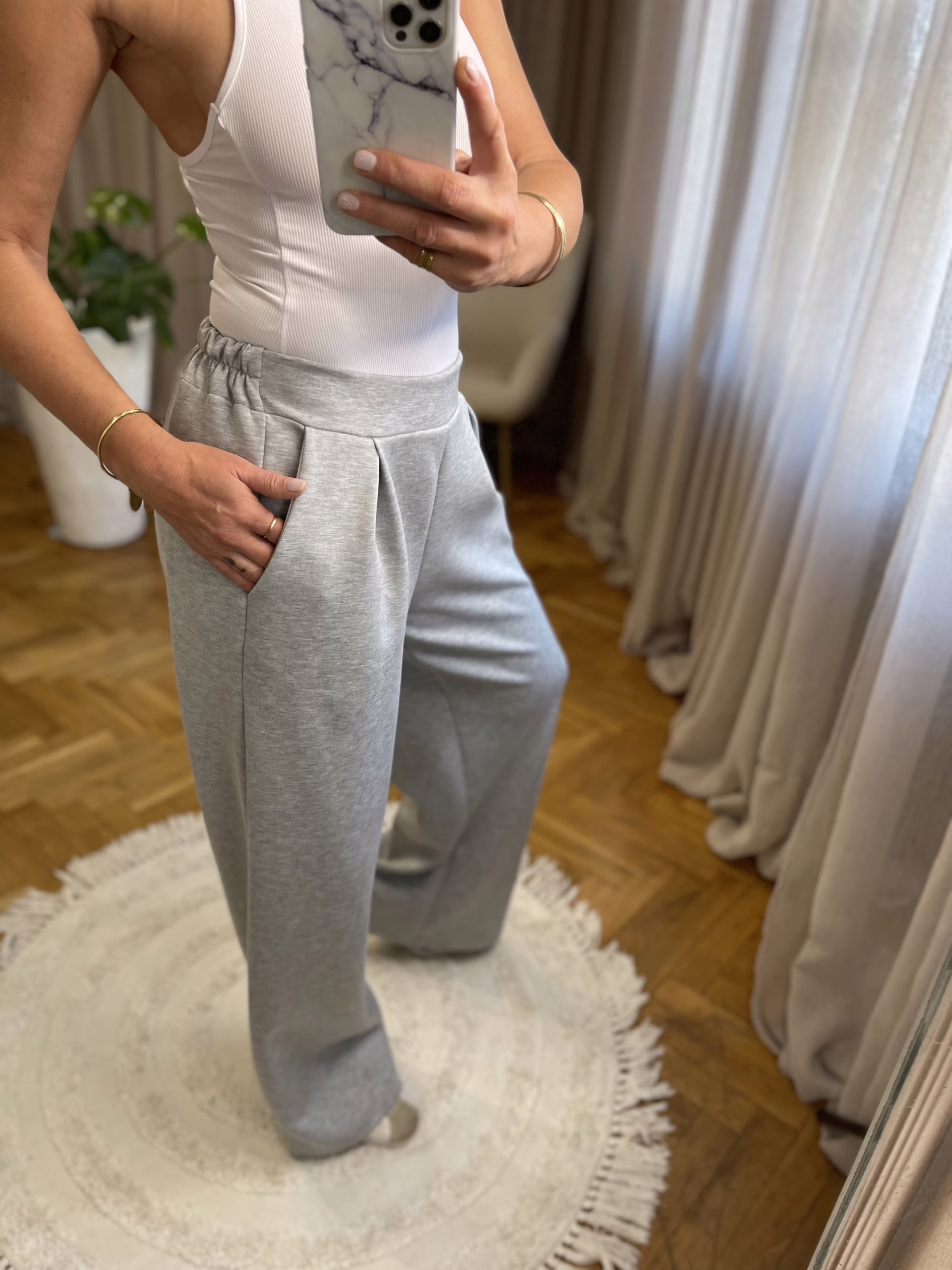 Stylowe spodnie dresowe damskie o szerokim kroju to idealne połączenie komfortu i nowoczesnego stylu. Wysoki stan oraz delikatne zakładki w pasie pięknie układają się na sylwetce, zapewniając wygodę i swobodę ruchów przez cały dzień. Miękka dzianina z dodatkiem wiskozy i modalu sprawia, że materiał jest przyjemny dla skóry, elastyczny i oddychający. To doskonały wybór do codziennych stylizacji – świetnie wyglądają zarówno z basicowym topem, swetrem, jak i jeansową koszulą lub sportową bluzą.